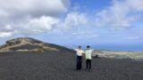 野田浜では古い火山の一つ岡田火山の説明。島内のビーチは黒い砂浜であることに生徒さんは驚いてました。目の前に流れる溶岩流からは黒い玄武岩がよく見れる島ということも知ってもらいました。
