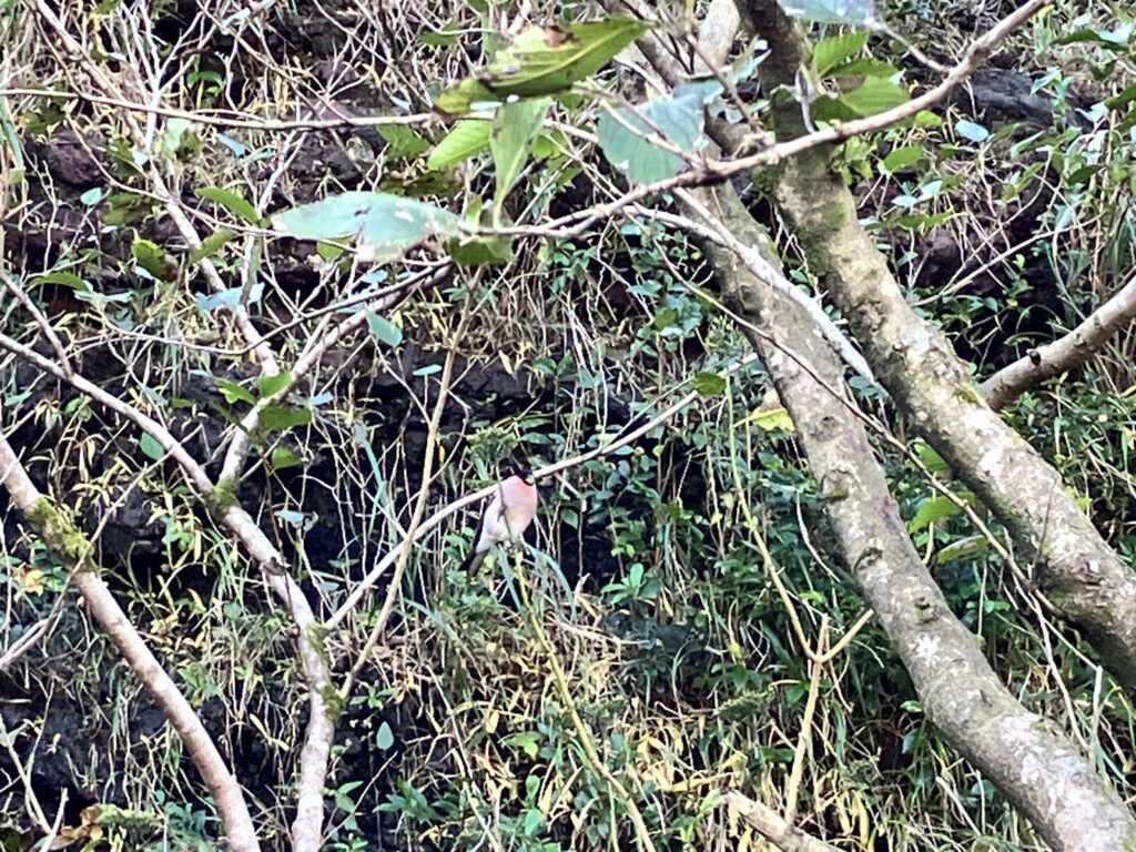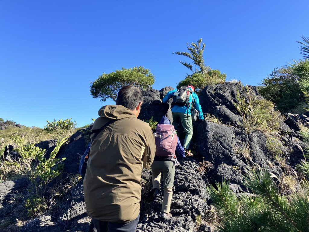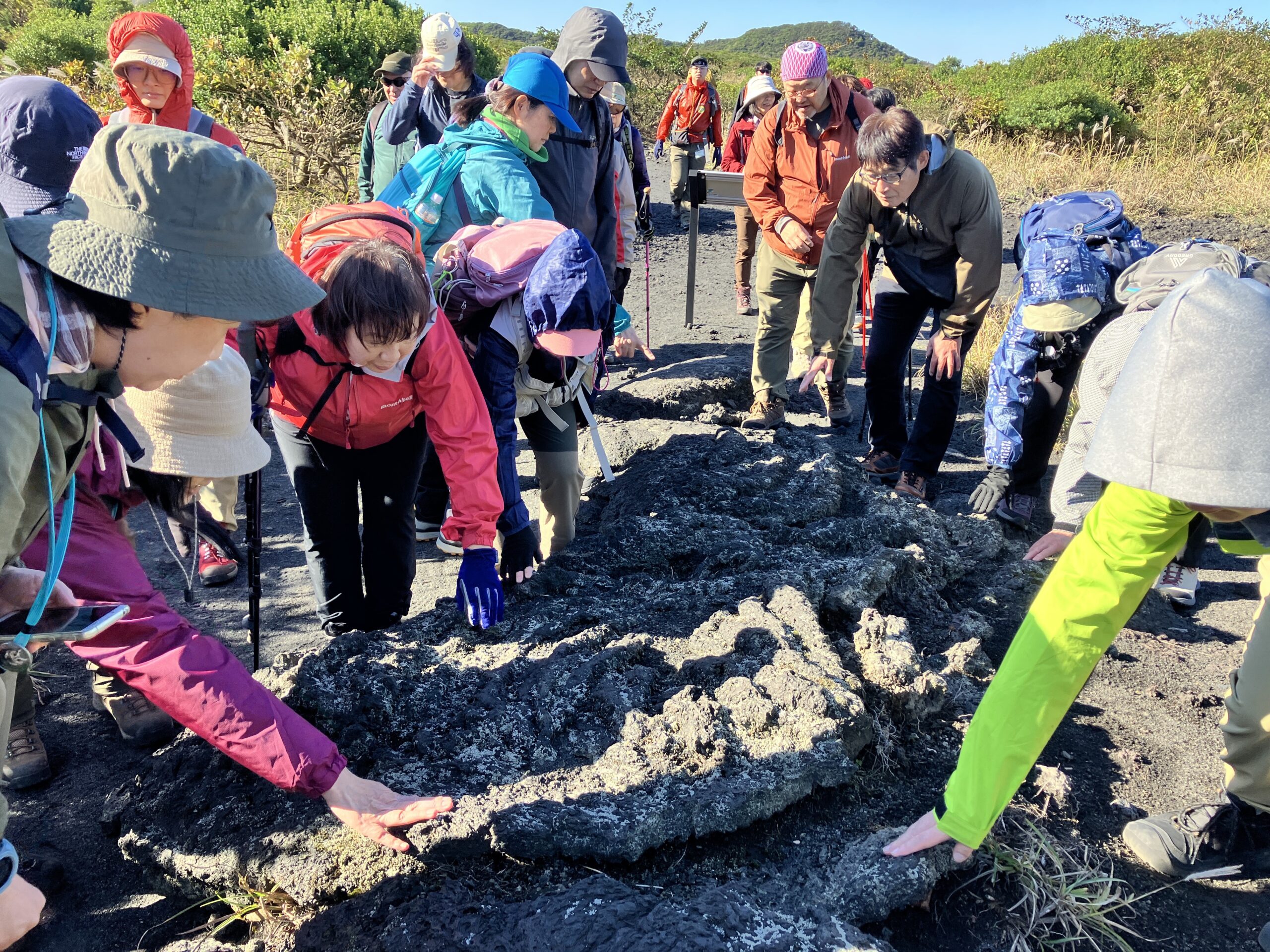 火山の荒々しい景観の中にも、命の息吹が感じられます。足元には溶岩の隙間から芽吹いた植物たち。ハチジョウススキやイタドリなど、火山の厳しい環境に適応して生きる姿に、参加者の皆さんも興味津々でした。途中では、木々の間から美しい鳴き声が。なんとウソが近くに現れ、赤い胸元が陽の光に映えてとてもきれいでした。「こんなに近くで見られるなんて!」と歓声が上がります。