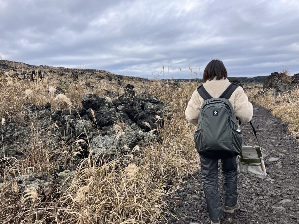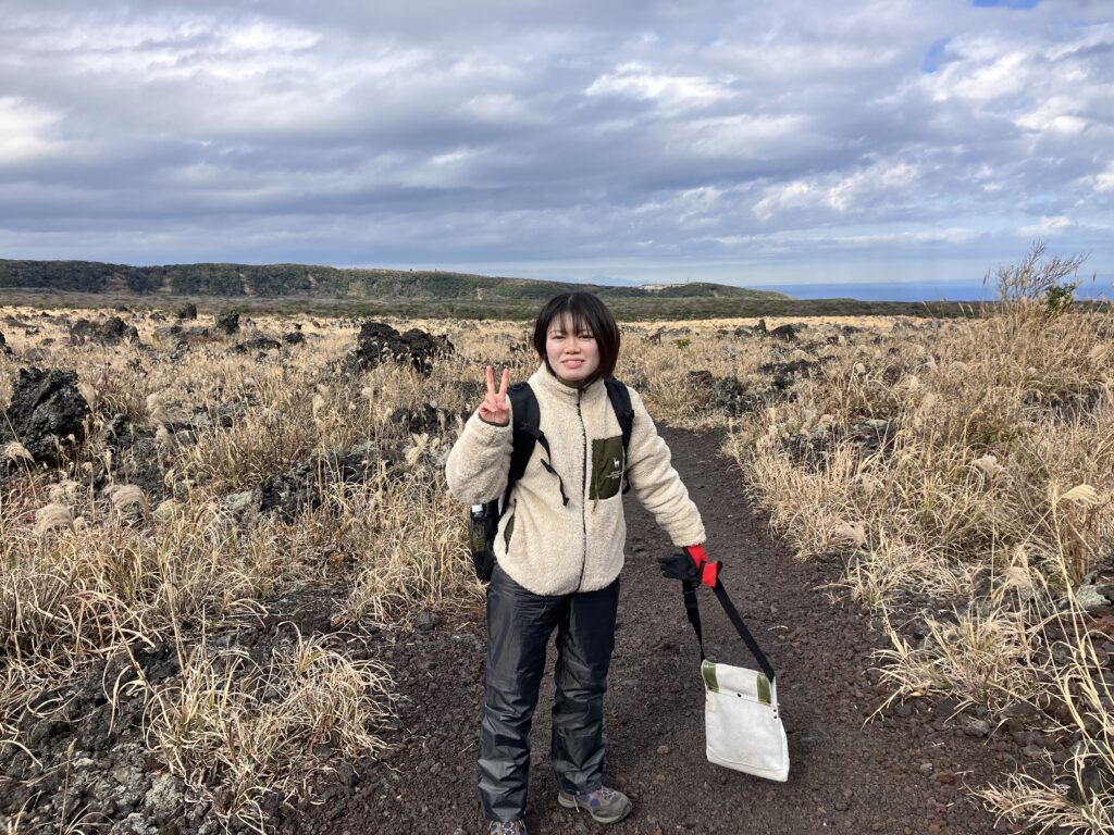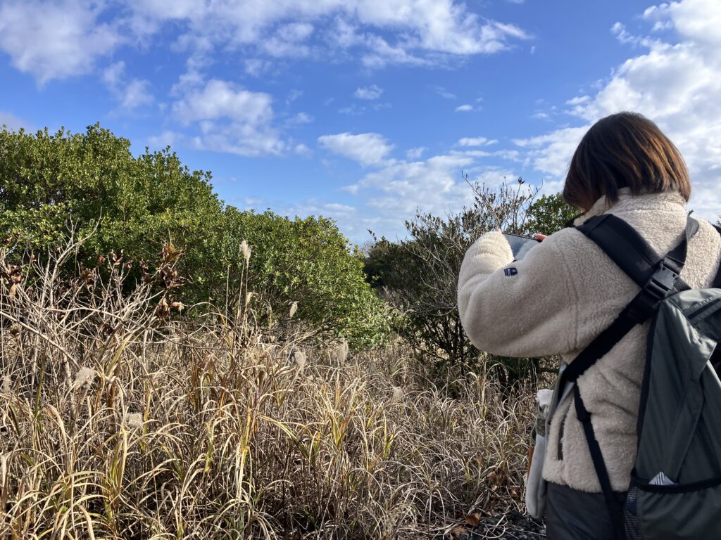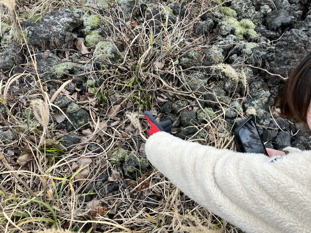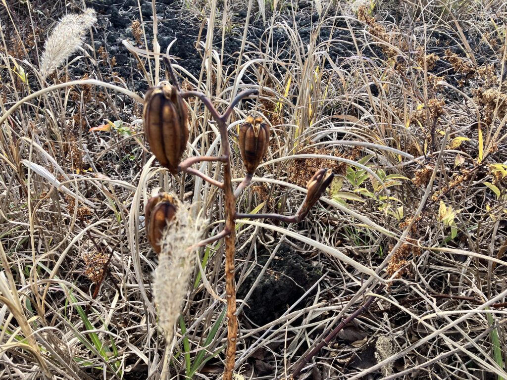 12/14(土) 気温は寒いが晴れ間あり。サクユリの蒴果に付く蛾の幼虫を研究をしている東京農業大学の学生さんと共に再生の一本道とジオロックガーデンを調査のために同行と案内をしました。白い大輪のサクユリが咲く三原山の未来に繋がる調査になりました。