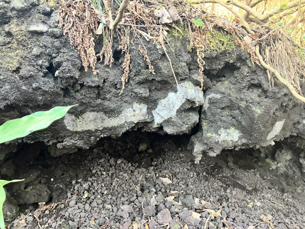 溶岩が作った「ジオ」の景色。海岸線では、森とはガラリと変わる景色に皆さん驚かれていました。ゴツゴツとした真っ黒な溶岩の上を歩きながら、岩の隙間にたくましく根を張る海辺の植物たちを観察。