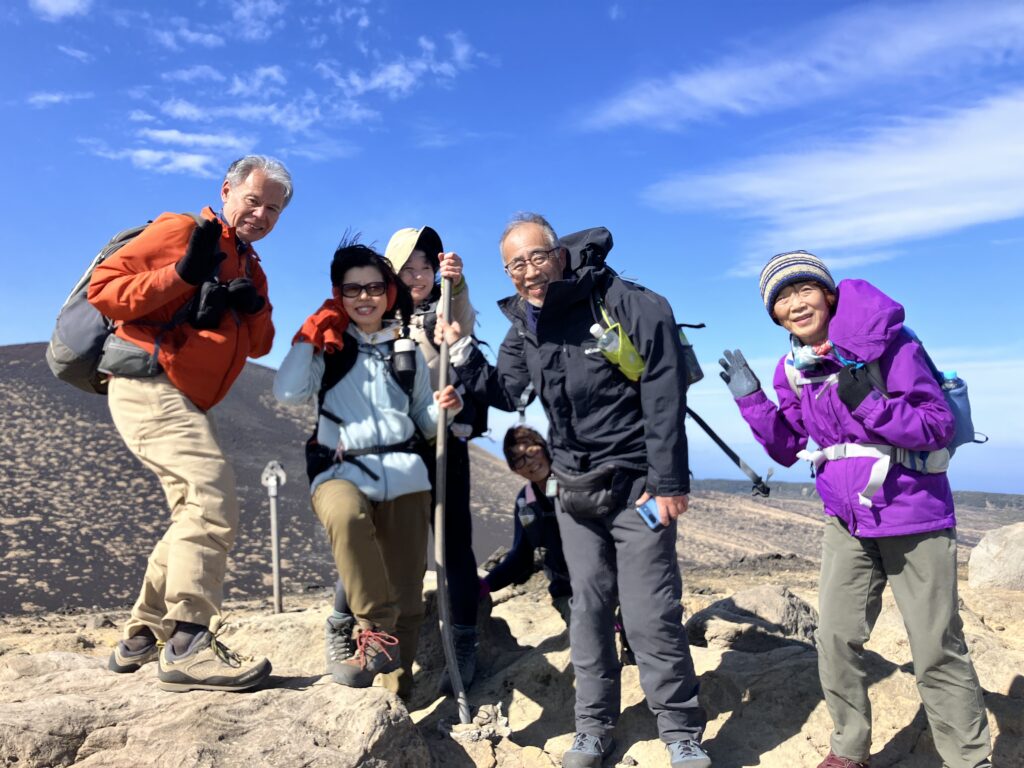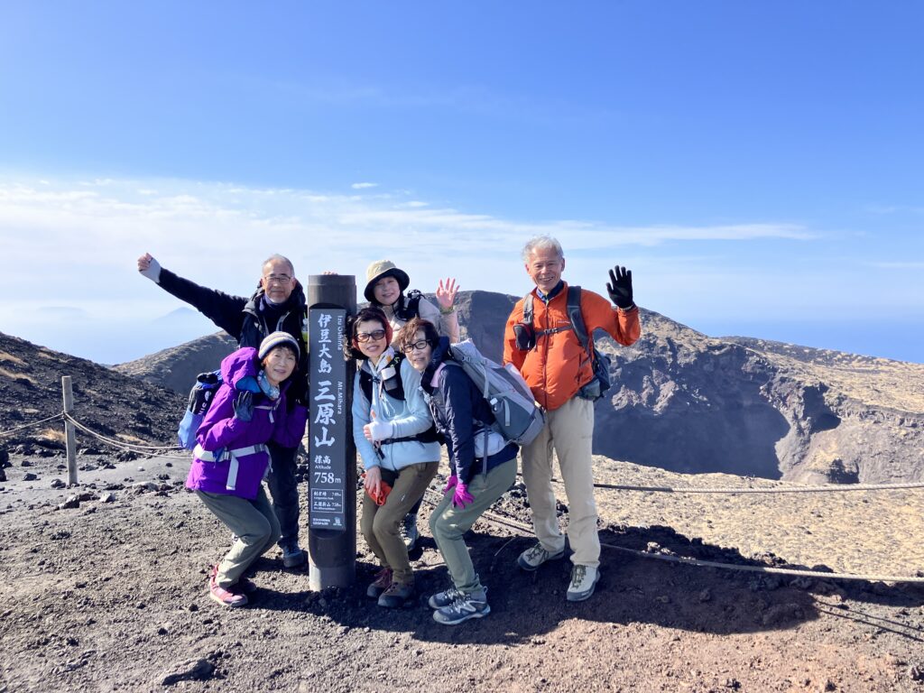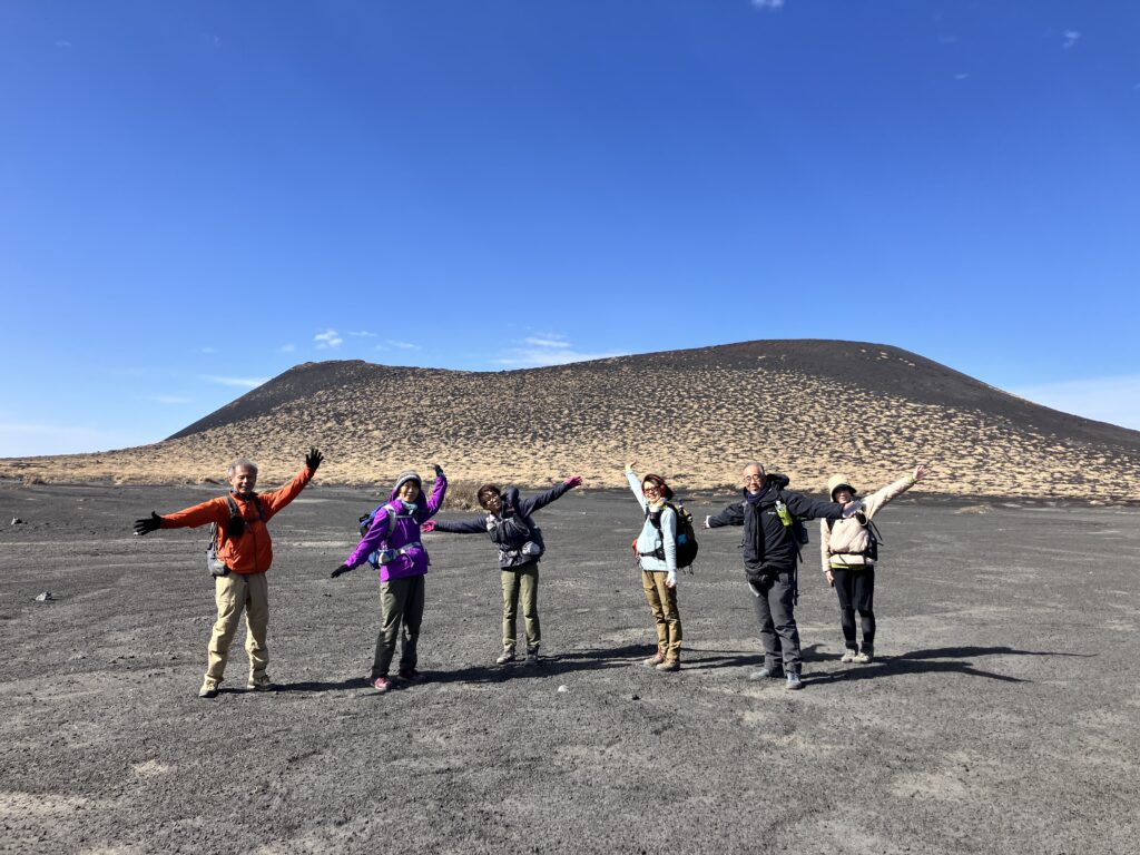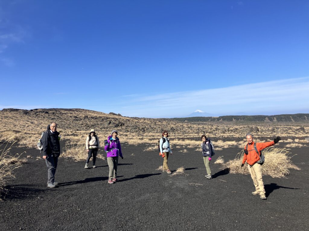 今回は、三原山の主要スポットを網羅する、体力自慢のサークルさんならではの欲張りルートです。溶岩流や火口、砂漠、富士山までよく見えて大満足のツアーになりました。