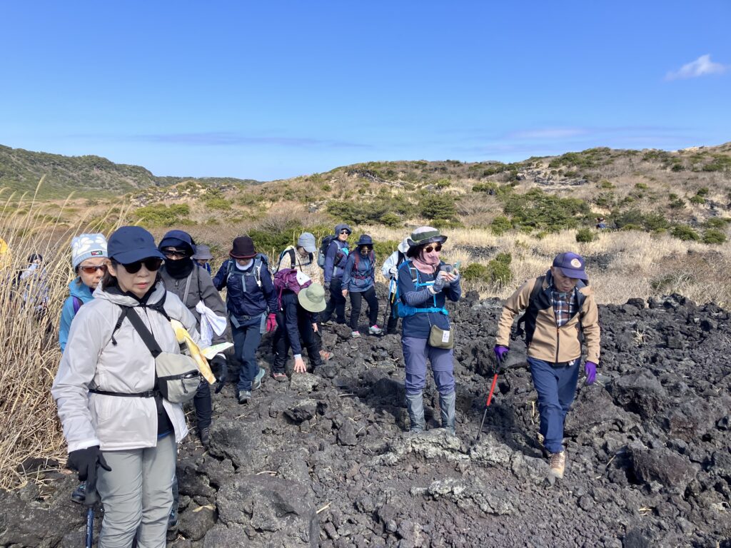 2/22(日)は、2月とは思えないほど気温が上がり、春の訪れを一足先に感じるような陽気となりました。今日は東北からお越しいただいた旅行会社様の団体ツアーをご案内!遠路はるばる大島へ来てくださった皆さんと歩いた、「三原山・半日ジオトレッキング」となりました!